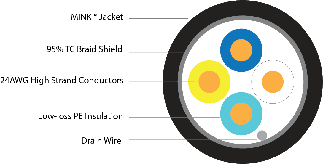 - 95% Braid with Drain Wire - full coverage shielding and easy termination