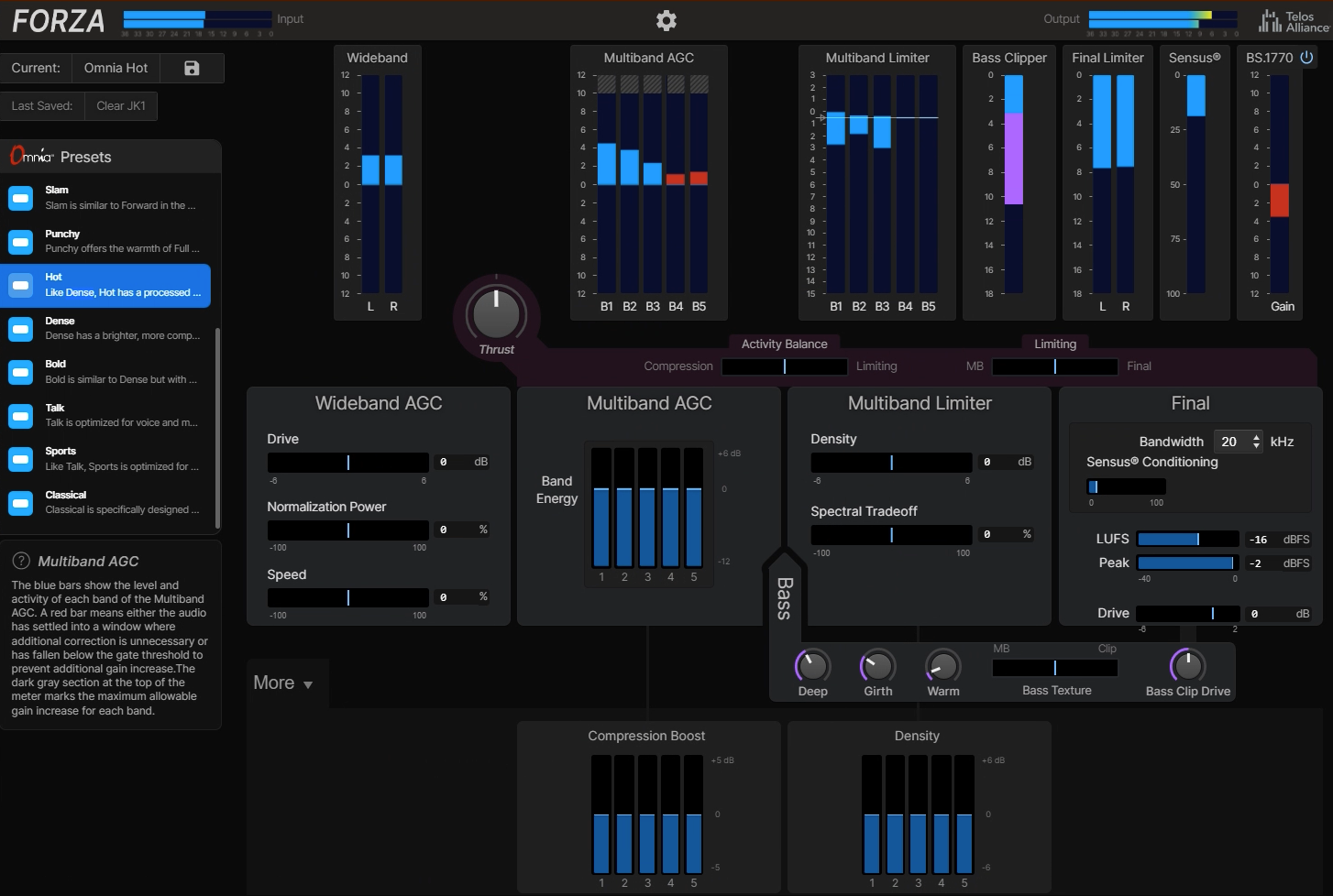 Forza’s all-new AGCs and multiband limiters breathe new life into the traditional five-band processor design, yielding a sonic profile that delivers a consistent and polished audio signature without sounding overly-processed.
