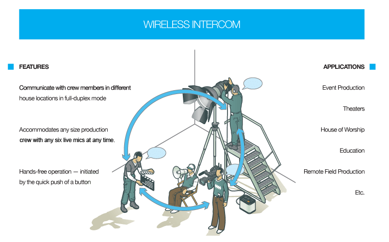 The DigiWave DWS-COM-4-400 wireless intercom system provides contactless two-way communication for up to four users within a 600-foot range. The system includes four DLT 400 full-duplex transceivers, four headset microphones, four power supply packs, a carry case, and silicone skins for the transceivers. Employing the same DSS frequency-hopping technology found in cell phones, the system offers an interference-free and highly secure method of communication.